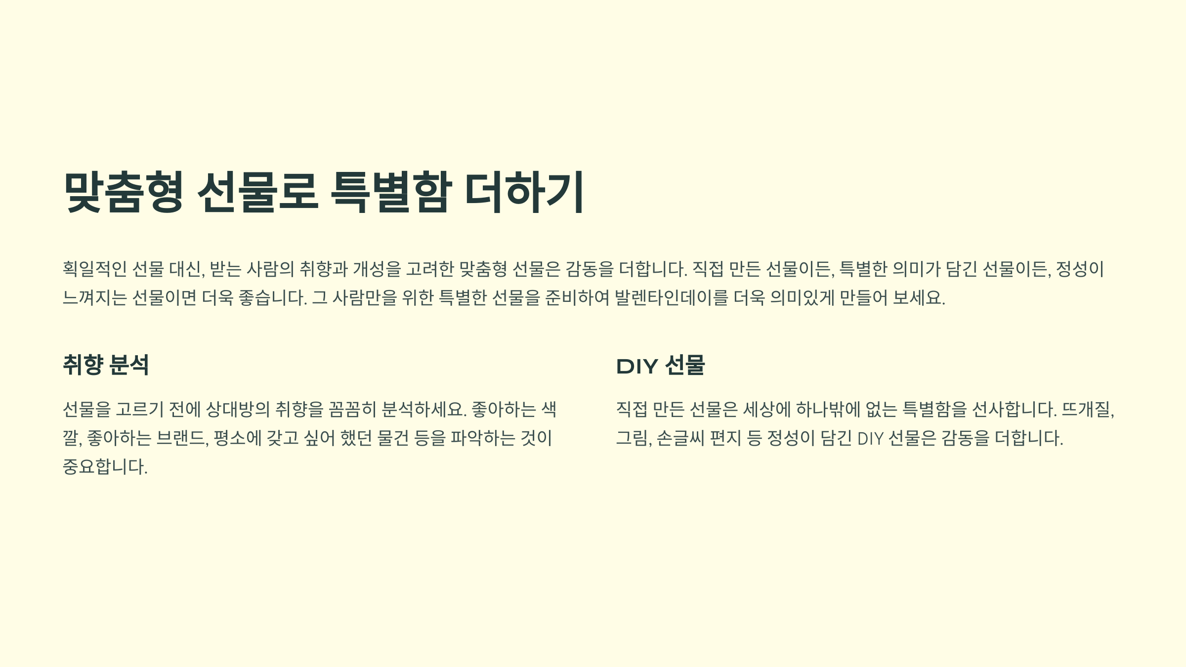 발렌타인데이에 맞춤형 선물은 특별한 의미를 더해줄 수 있어요. 맞춤형 아이템은 상대방만을 위한 선물이라는 점에서 감동을 줄 수 있답니다. 🎁