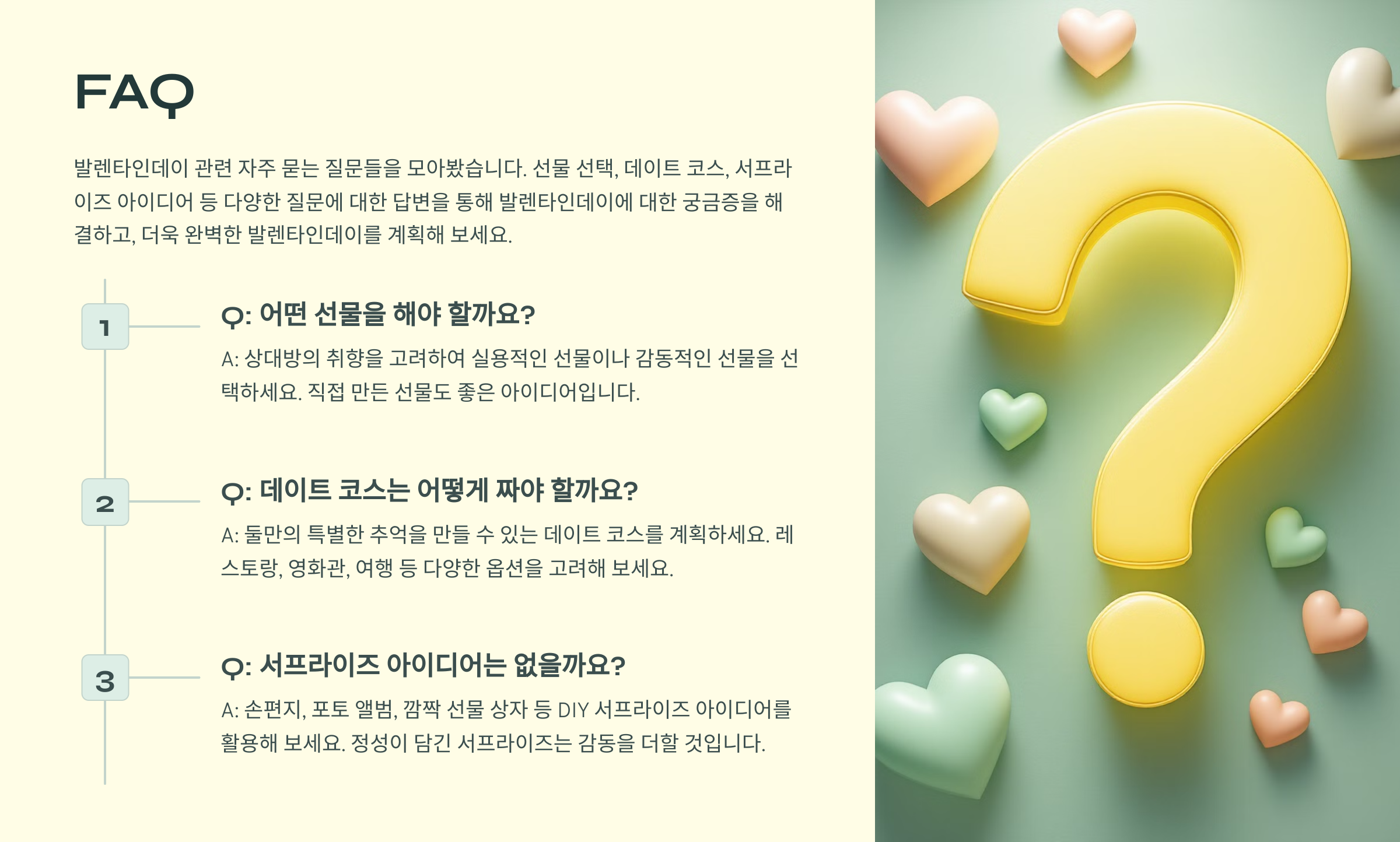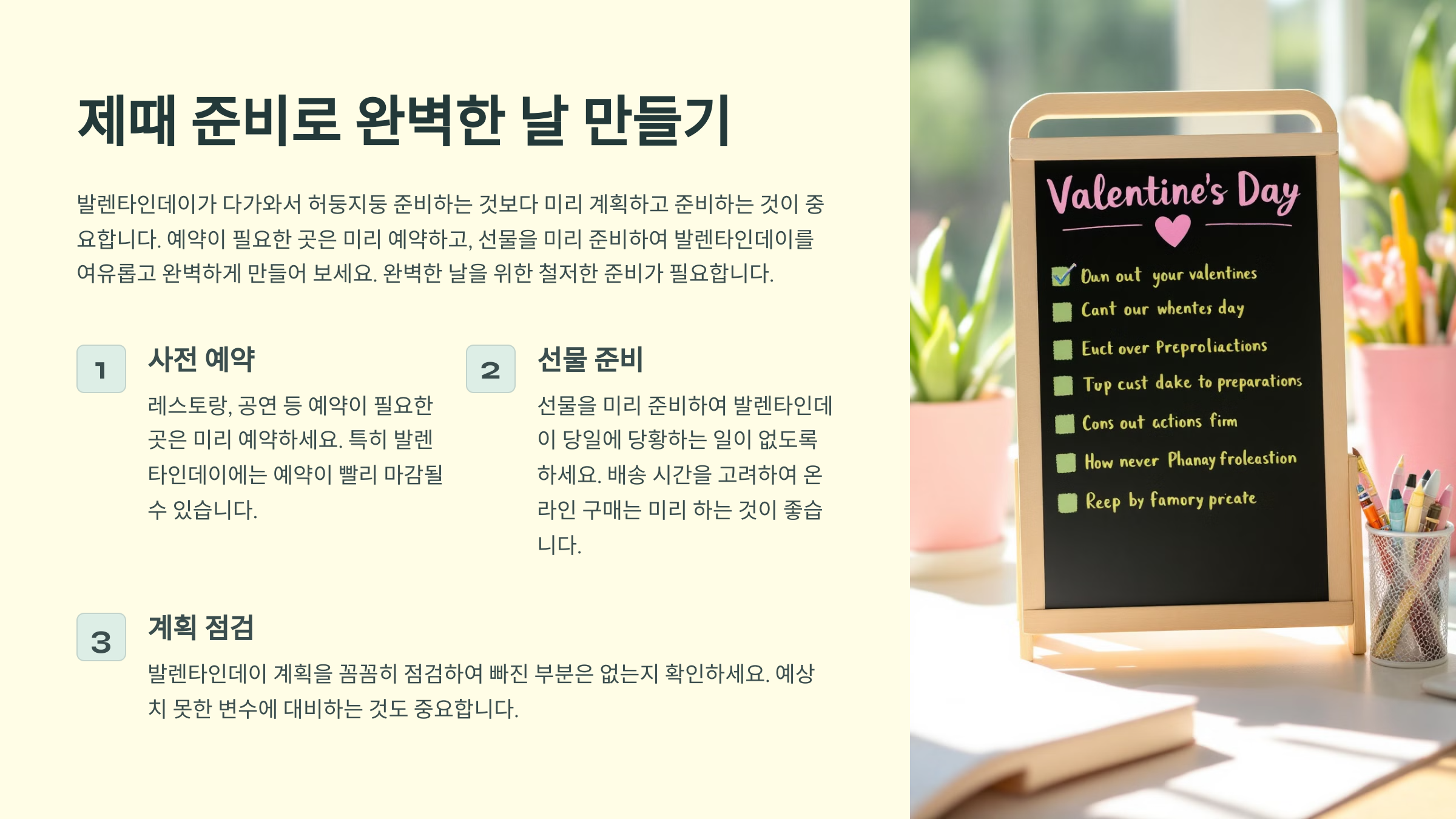 성공적인 발렌타인데이를 위해선 차분하게 계획하고 실행하는 것이 중요해요. 미리 준비된 사람에게는 걱정도 줄어들고, 더욱 완벽한 하루를 보낼 수 있을 거예요!