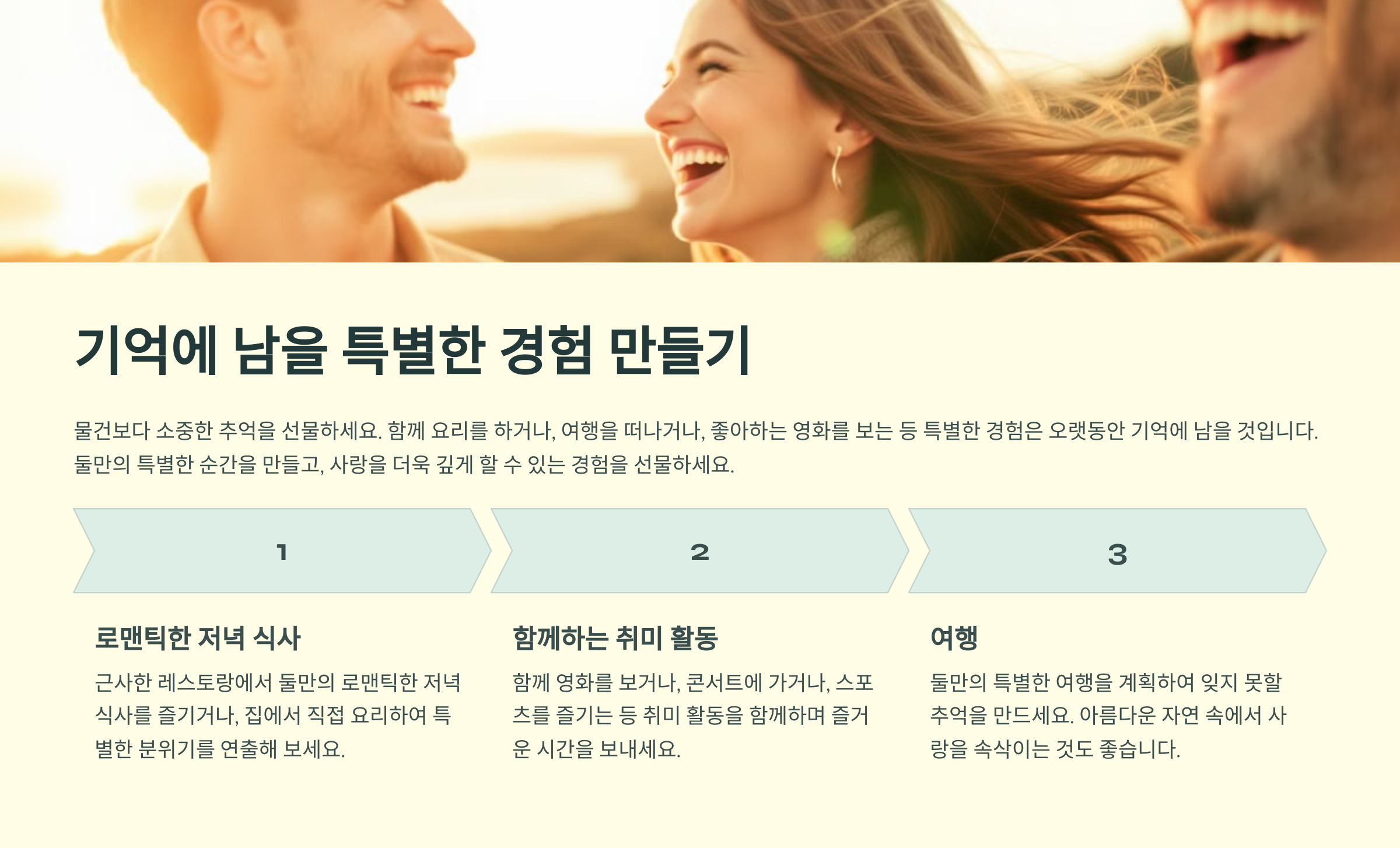 선물 자체도 중요하지만, 함께 보낸 시간이 더 오래 기억에 남는 경우가 많아요. 특별한 경험을 함께 만드는 것이 발렌타인데이를 더욱 뜻깊게 만들어요. 🌅
