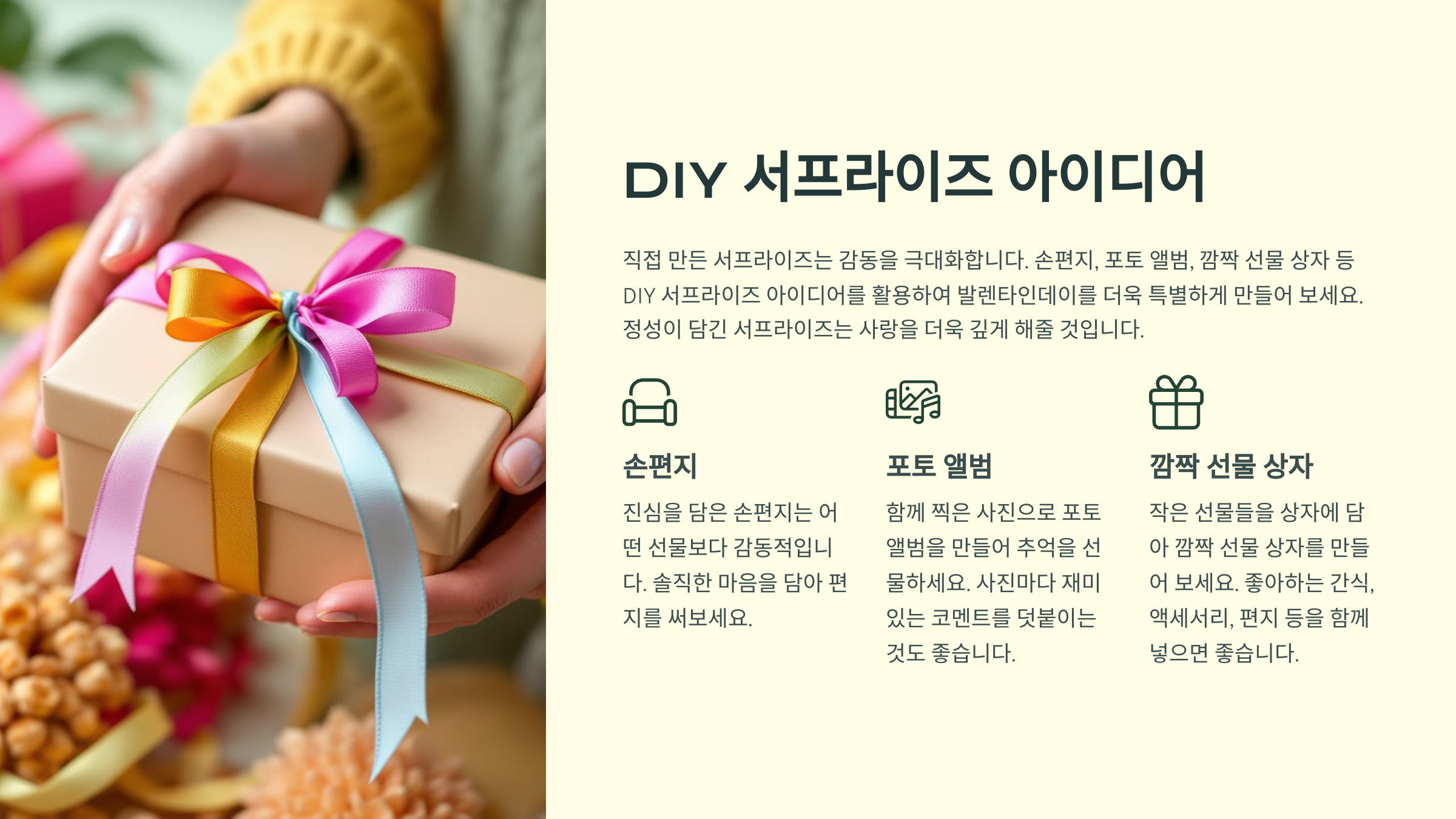 직접 만든 선물과 서프라이즈는 감동을 극대화시킬 수 있어요. 특히 수제 초콜릿이나 편지는 상대방에게 진심을 전하기에 딱이에요! 🍫