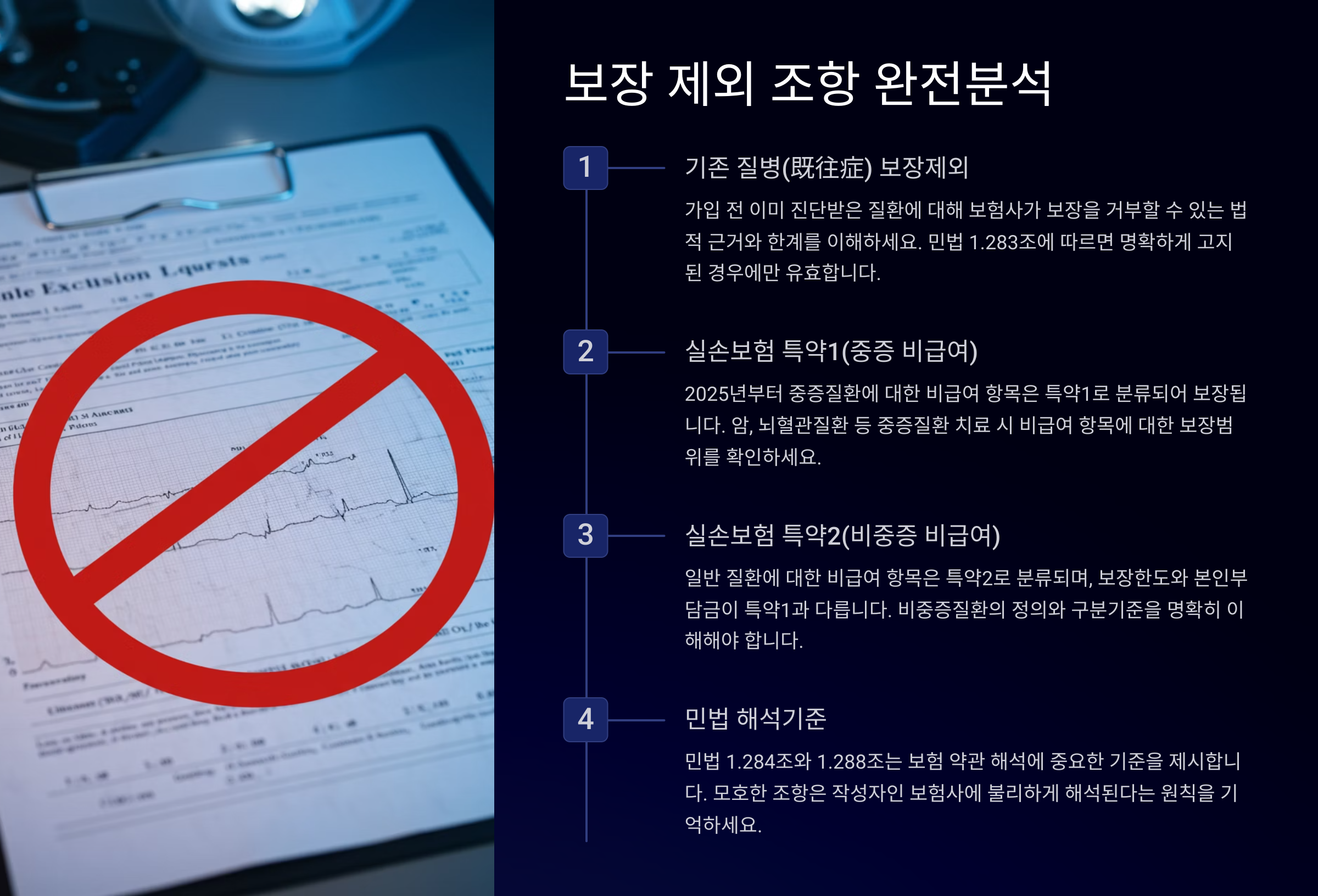 네 번째는 '특정 질병군 제외'예요. 보험사마다 보장하지 않는 특정 질병군이 있어요. 예를 들어 정신질환, 치과 질환, 성병, 직업병 등은 기본적으로 제외되는 경우가 많아요. 또한 미용이나 성형 목적의 치료, 실험적 치료, 대체의학 치료 등도 제외될 수 있어요.